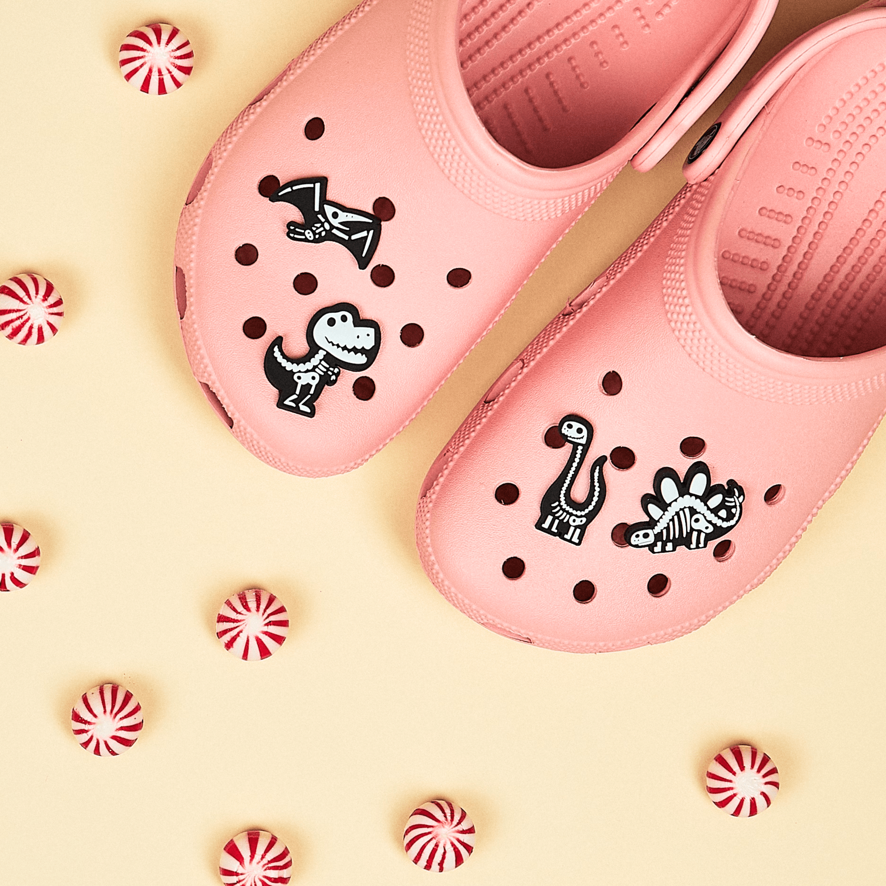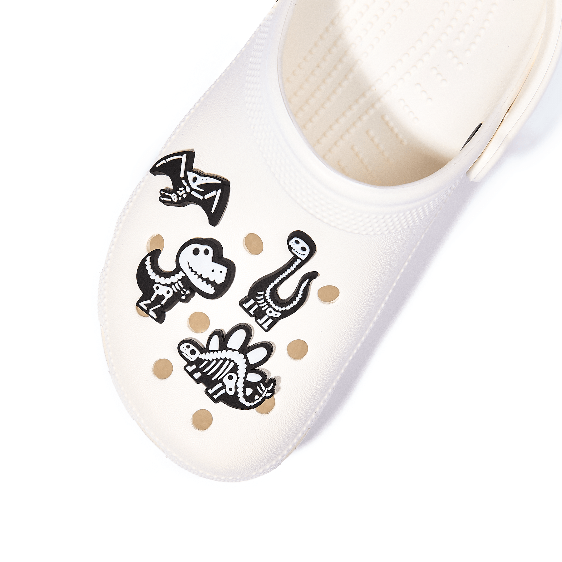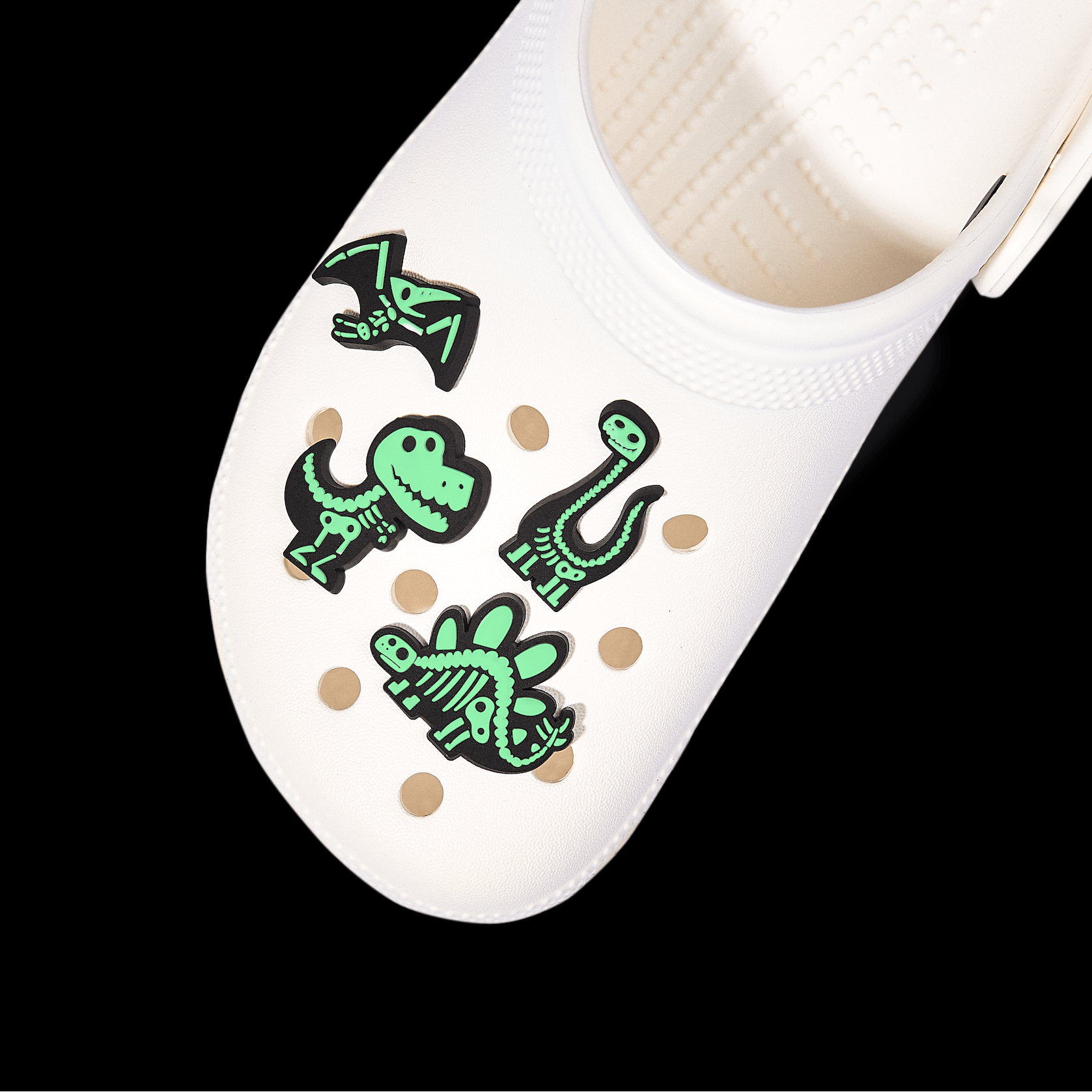 Glow up your favorite clogs with Mike Bennett's glow-in-the-dark dinosaur skeleton character charms! Effortlessly pops into your favorite clogs. Grab yours before they go extinct!